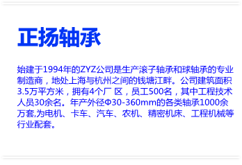 始建于1994年的ZYZ公司是生產(chǎn)滾子軸承和球軸承的專業(yè)制造商,地處上海與杭州之間的錢塘江畔。公司建筑面積3.5萬平方米,擁有4個廠?區(qū),員工500名,其中工程技術人員30余名。年產(chǎn)外徑Φ30-360mm的各類軸承1000余萬套,為電機、卡車、汽車、農(nóng)機、精密機床、工程機械等行業(yè)配套。